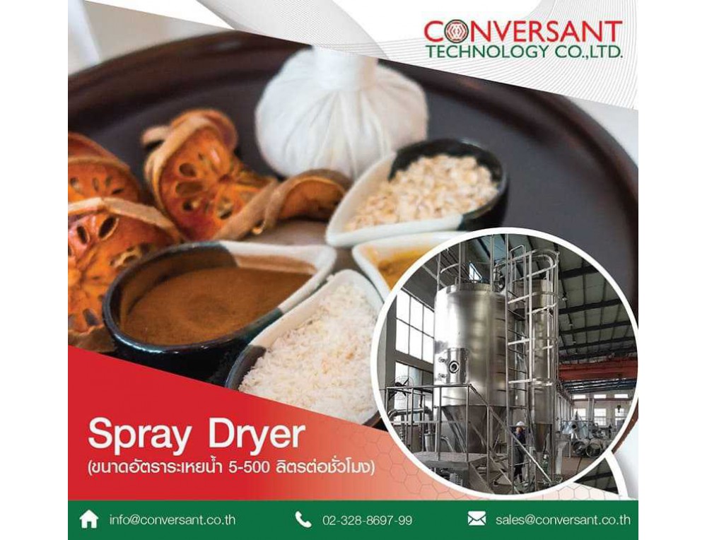 เครื่องทำแห้งแบบพ่นฝอย สำหรับทำแห้งสารสกัดสมุนไพร เช่น ขมิ้นพญายอ และผลิตภัณฑ์อาหาร เช่น ชา ครีมเทียม ด้วยความร้อน สามารถออกแบบให้เหมาะสมกับแต่ละประเภทของผลิตภัณฑ์ได้และรุ่นพิเศษสามารถทำการทำแห้งสารสกัดที่สกัดด้วยตัวทำละลายประเภทออร์แกนิคส์โซลเว้นได้ หรือผลิตภัณฑ์ที่มีความหวานสูง เหมาะกับสารสกัดสมุนไพรมีขนาดตั้งแต่อัตราการระเหยแห้ง (Evaporation rate) 5 ลิตร/ชั่วโมง ไปถึง 500 ลิตร/ชั่วโมง