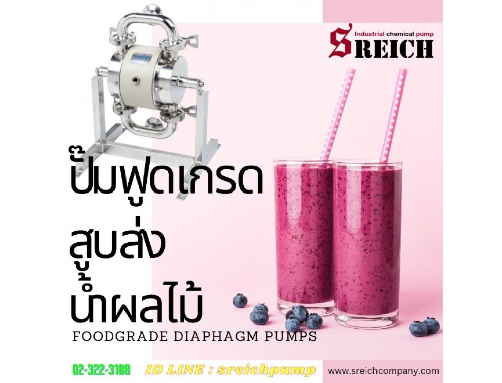 เครื่องสูบส่งอาหาร ปั๊มฟูดเกรด ปั๊มสูบส่งเครื่องดื่ม ปั๊มสูบส่งน้ำผลไม้ ปั๊มสูบส่งอาหาร ในงานที่เน้นสุขอนามัย ปั๊มดับเบิ้ลไดอะแฟรม (Sanitary Pump) เป็นปั๊มสวีเดน ใช้ในอุตสาหกรรมอาหารและเครื่องดื่ม สามารถจ่ายของเหลวได้สูงถึง 570 ลิตร/นาที และส่งแรงดันสูงสุดได้ถึง 8 บาร์ ปั๊มผลิตด้วยวัสดุสแตนเลสสตีล 316L (ปั๊มสูบส่งฟู้ดเกรด) ทางเรามีผู้เชี่ยวชาญที่จะให้คำปรึกษาและแนะนำสินค้าได้ตรงตามการใช้งานของลูกค้า โทร 023223188 (ฝ่ายการตลาด)