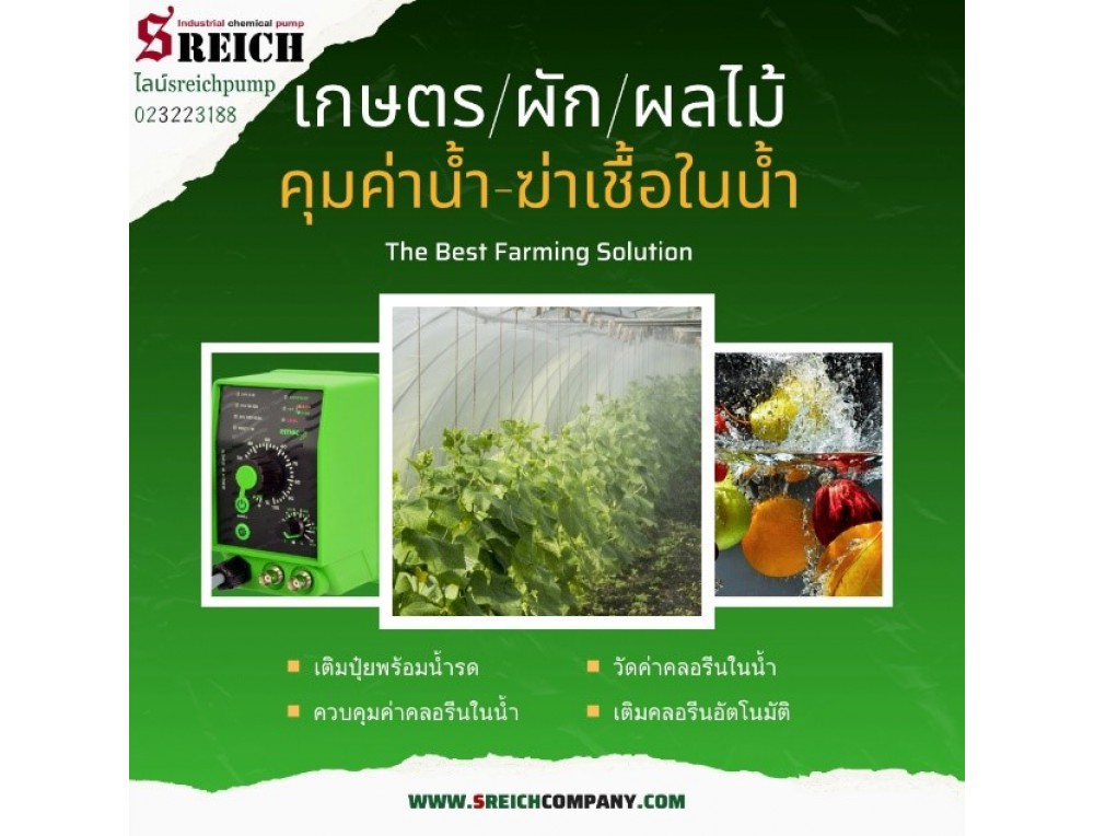 เอส ไรคส์ แนะนำปั๊มสูบส่งสารสเปรย์ออกหัวจ่ายในการเกษตร ปั๊มอัดฉีดปุ๋ย กระจายไปพร้อมน้ำ เพื่อเติมปุ๋ยได้ทั่วถึง แบบอัตโนมัติ รวมถึงการกระจายน้ำ การทำความสะอาดพืชผลด้านการเกษตร เช่น บำบัดน้ำใช้ล้างผัก ล้างผลไม้ เป็นต้น Dosing pump for Fertigation by S Reich 023223188